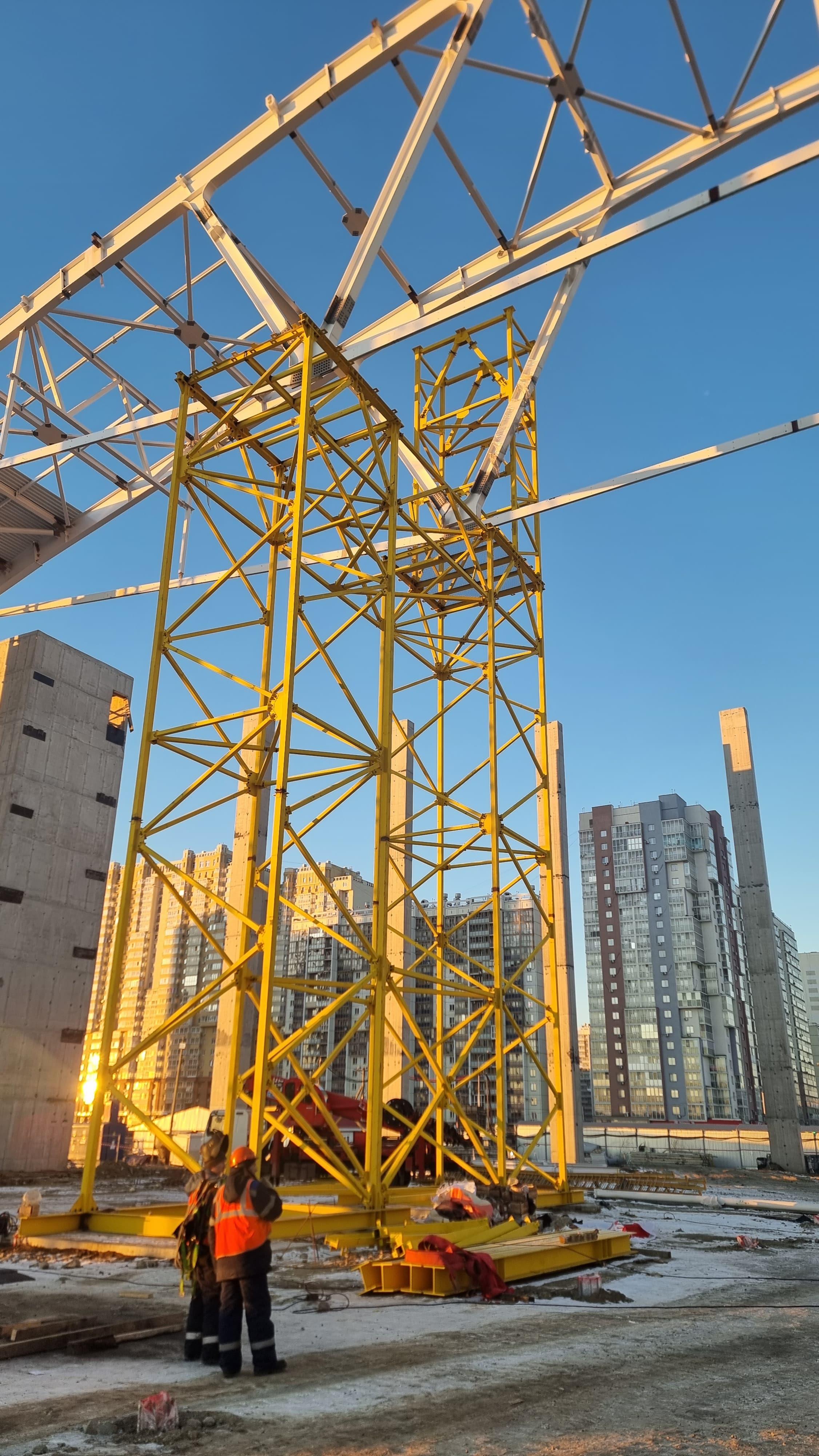 Объект: "Крытый футбольный Манеж" г. Челябинск Особенности объекта: демонтаж металлоконструкций находящихся в аварийном состоянии, была установлена система из 12 домкратов для снятия напряжения элементов связевого блока покрытия, демонтаж проходил с использованием двух кранов МКГС-100 и Zoomlion ZRT-600. Вес смонтированных конструкций составил 230 тонн, вес ИВПК (индивидуальных временных поддерживающих конструкций) составил 150 тонн. Затраченное время 2 недели.